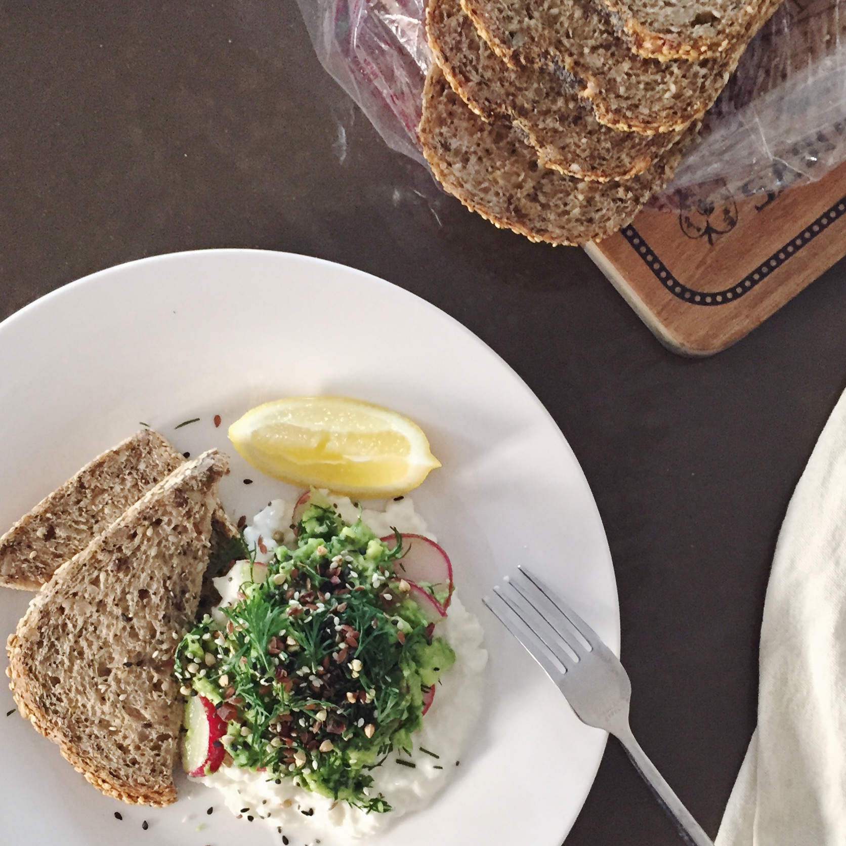 Avo + cottage cheese + radishes + dill + seeds + lemon