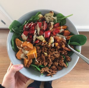 Ingredients: vegetables of choice, protein of choice, carbs of choice and flavour toppers of choice.