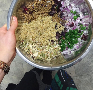 What’s in it: coriander, parsley, red onion, freekah, puy lentils, pumpkin seeds, almonds, pinenuts, capers, currants, lemon, olive oil, pomegranate, yoghurt, cumin, honey