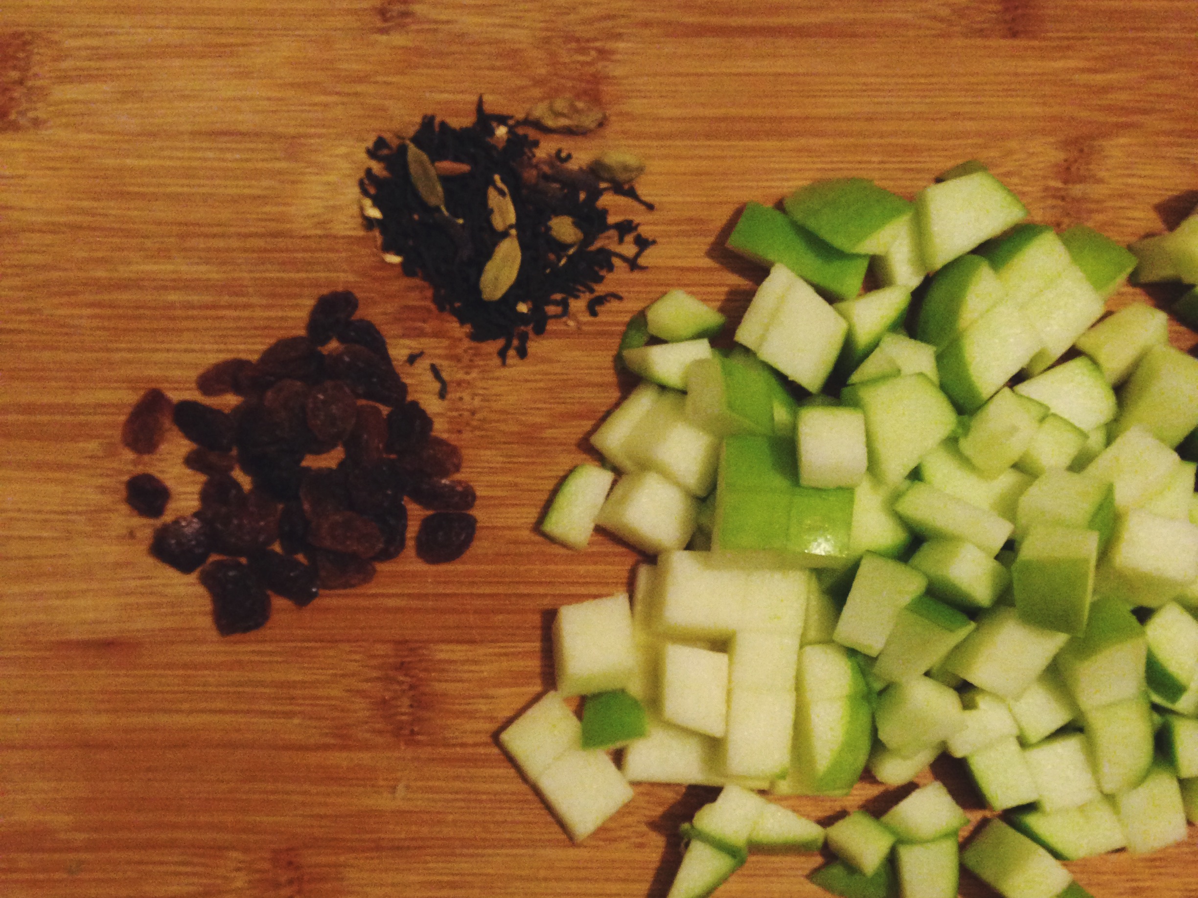 Place apples, tea, sultanas, cinnamon & maple syrup (I liked this addition, omit/change if you like ) in saucepan, and simmer until apples are tender & liquid is reduced.