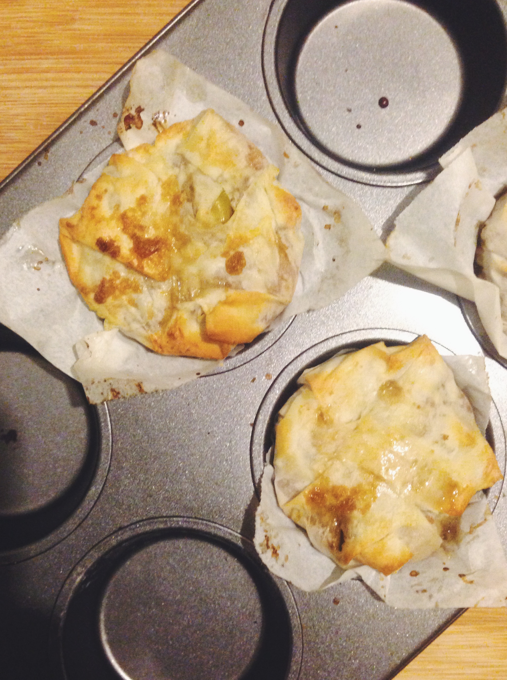 Line two cups with baking paper and three sheets of filo, and divide apple mixture evenly.